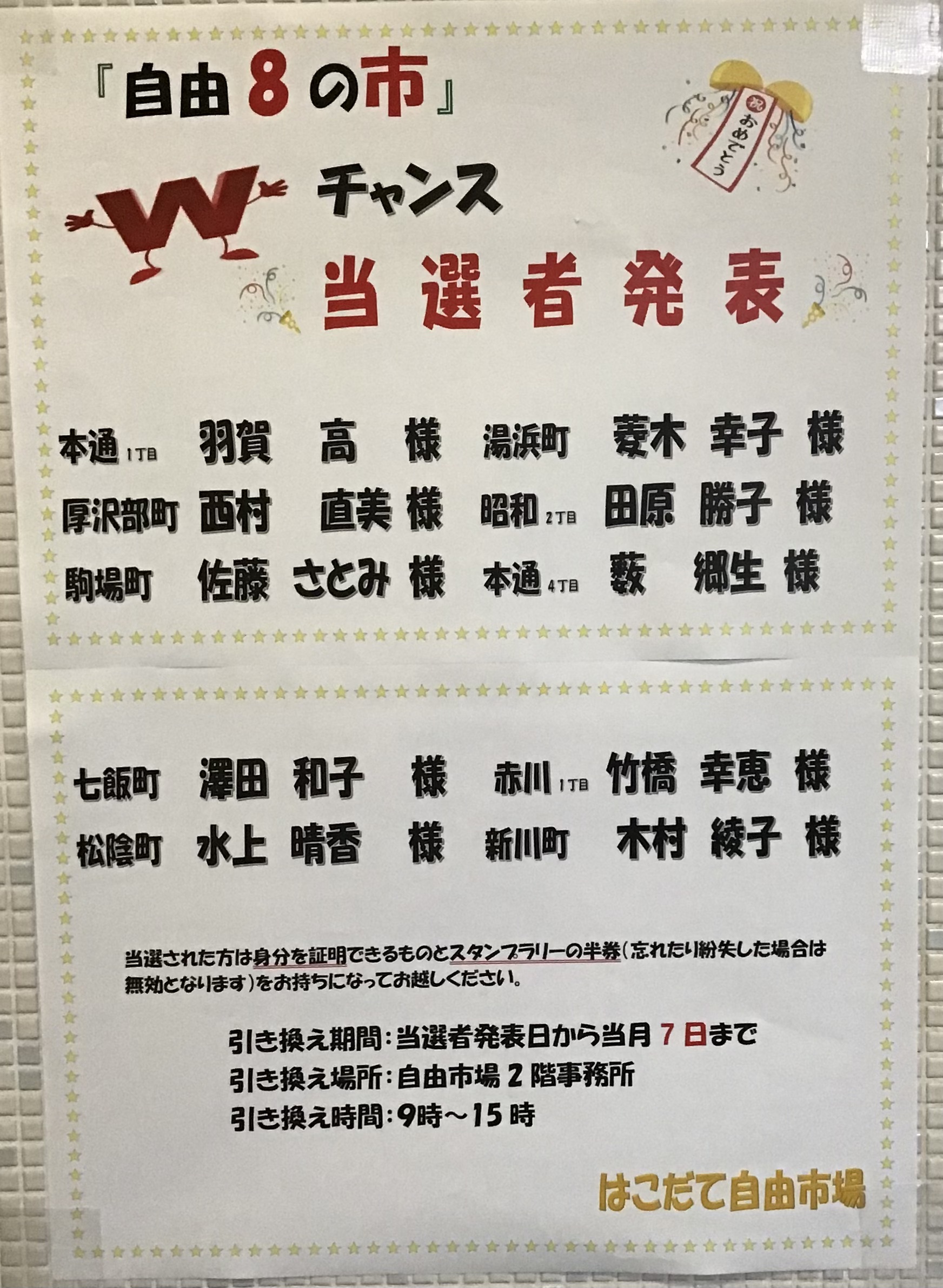 本日、自由8の市Wチャンス当選者発表‼️