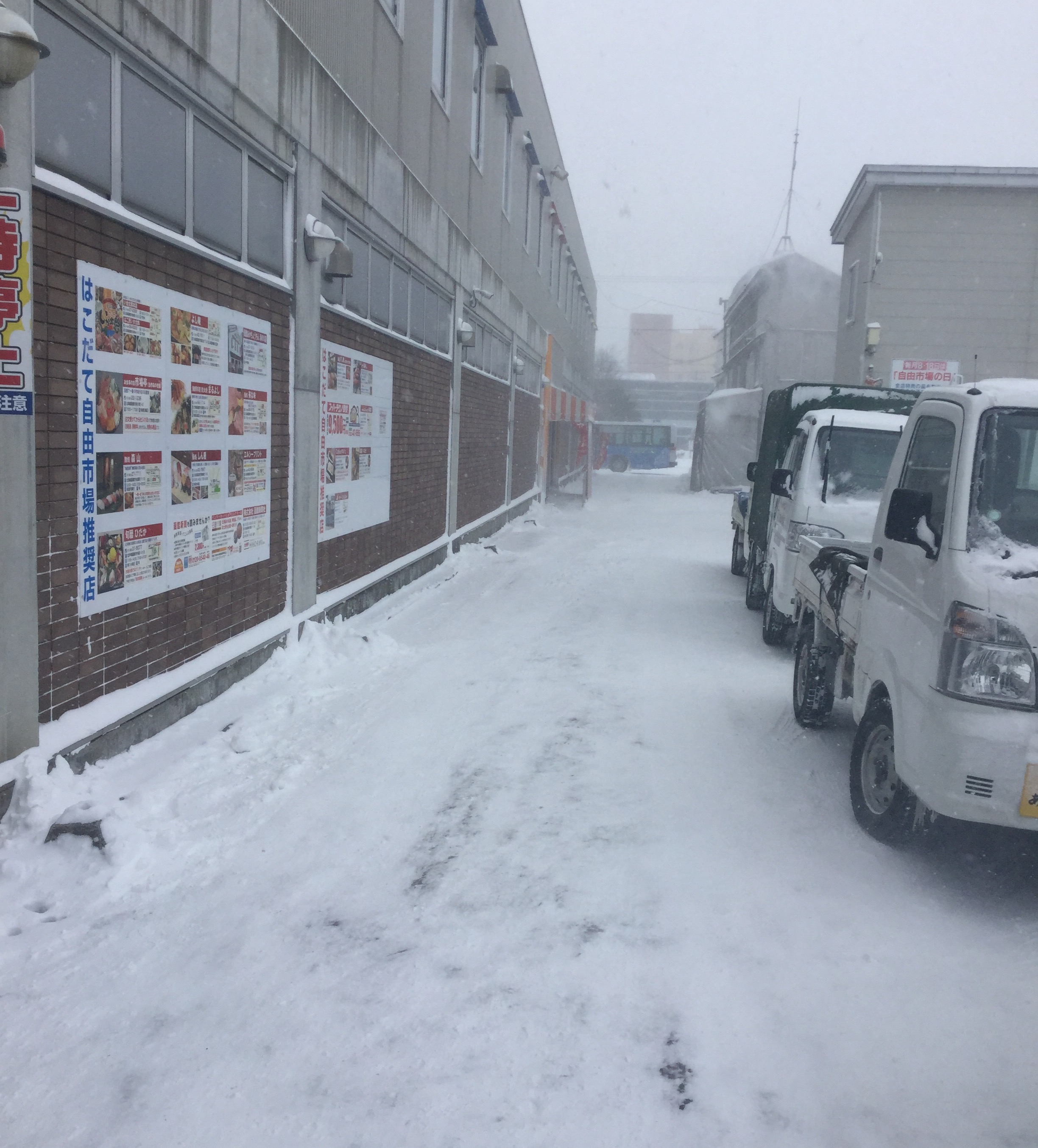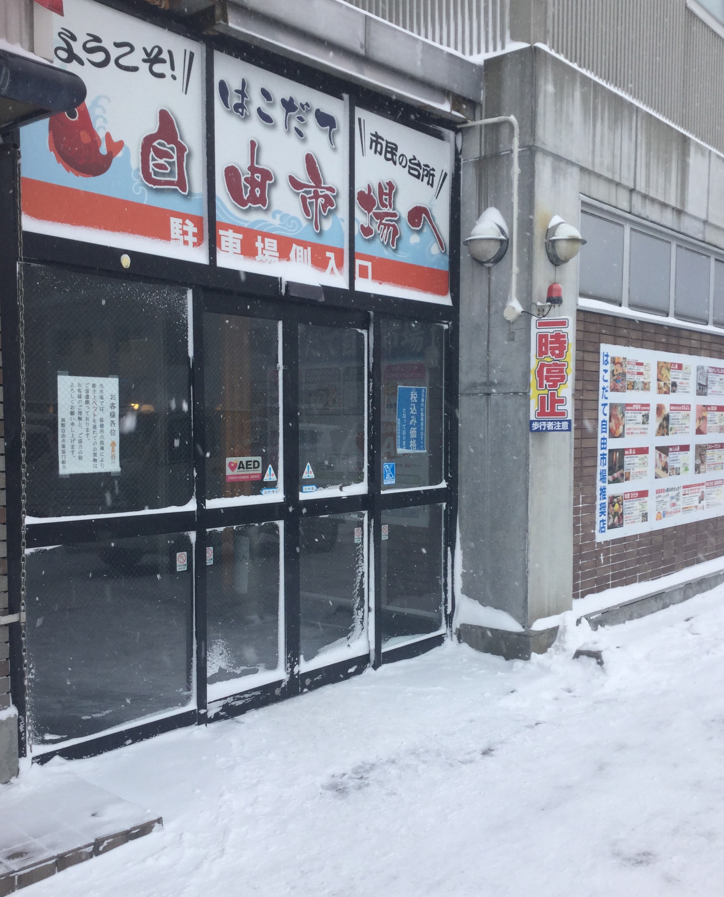 今日の函館は風が強く自由市場の自動ドアも